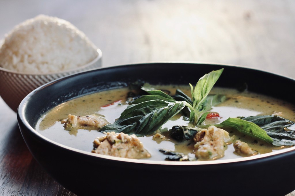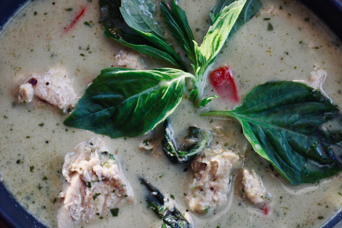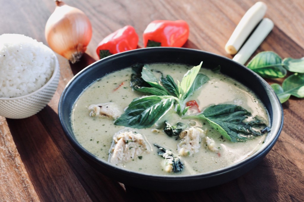 - In the chicken add the curry paste, coconut milk, coconut cream, chicken stock, sweet peppers, and kaffir lime leaves. Let it marry for about 10 minutes. Enjoy this authentic green curry! Serve with black rice for more nutrients.