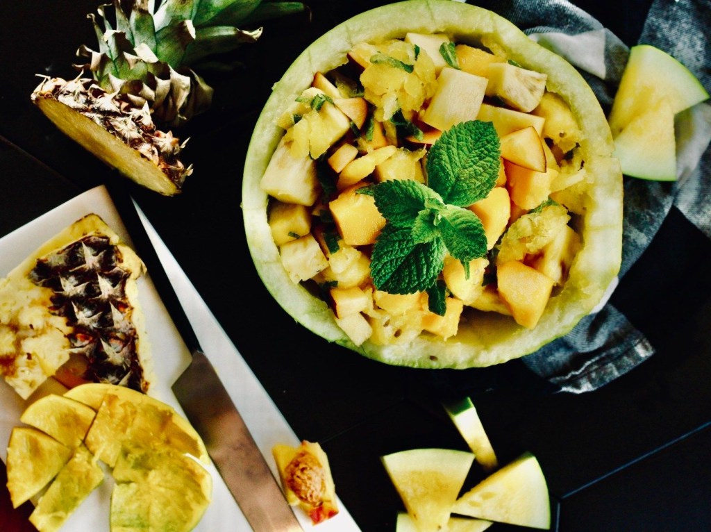 So then we decided to use it in a fruit salad or melody, we had other fresh fruits on hand that we cut up and threw it all together, then we chopped some of our apple-mint that’s growing like crazy and tossed it in for some freshness! Now, about these yellow watermelons….