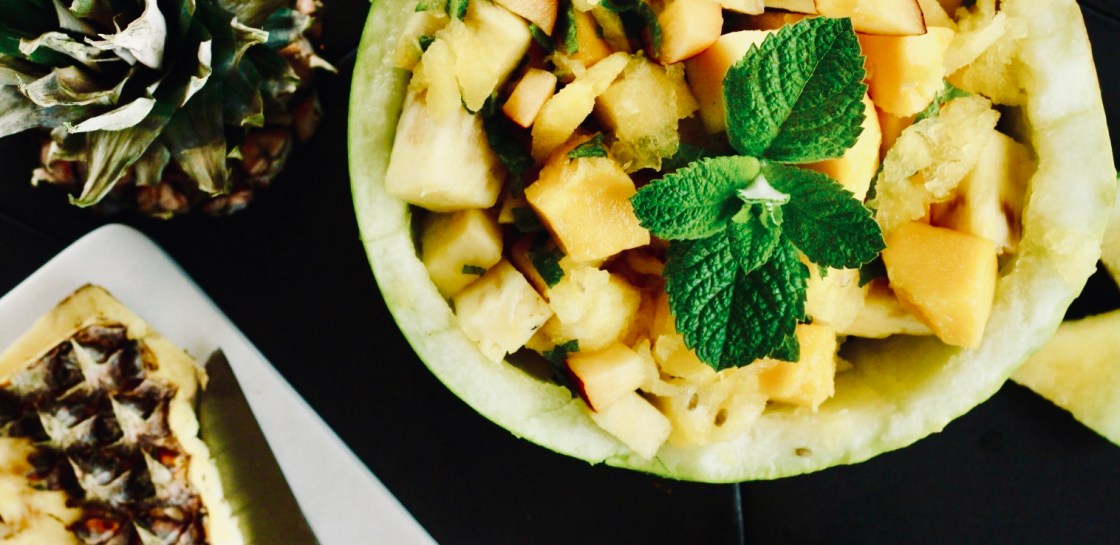 Chop up some yellow watermelon in cubes then add any fruit you like, I did pineapple, mango, peaches, and Apple-mint. Serve and enjoy!!! Best on hot sunny days:)