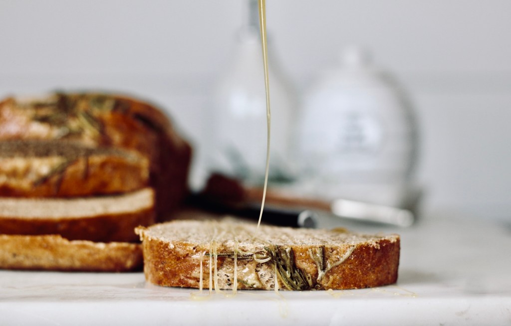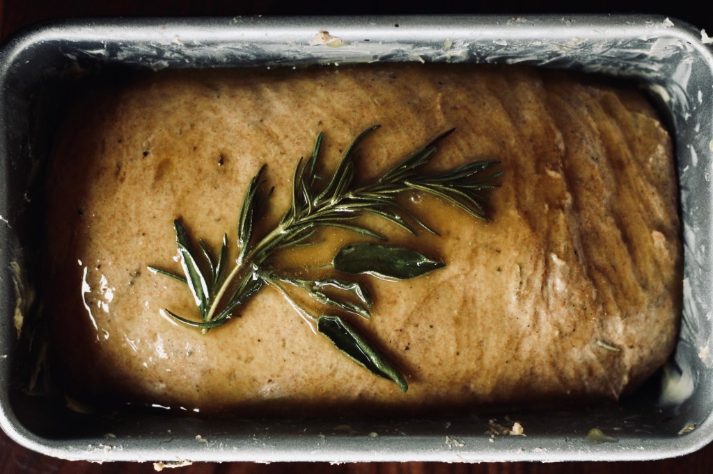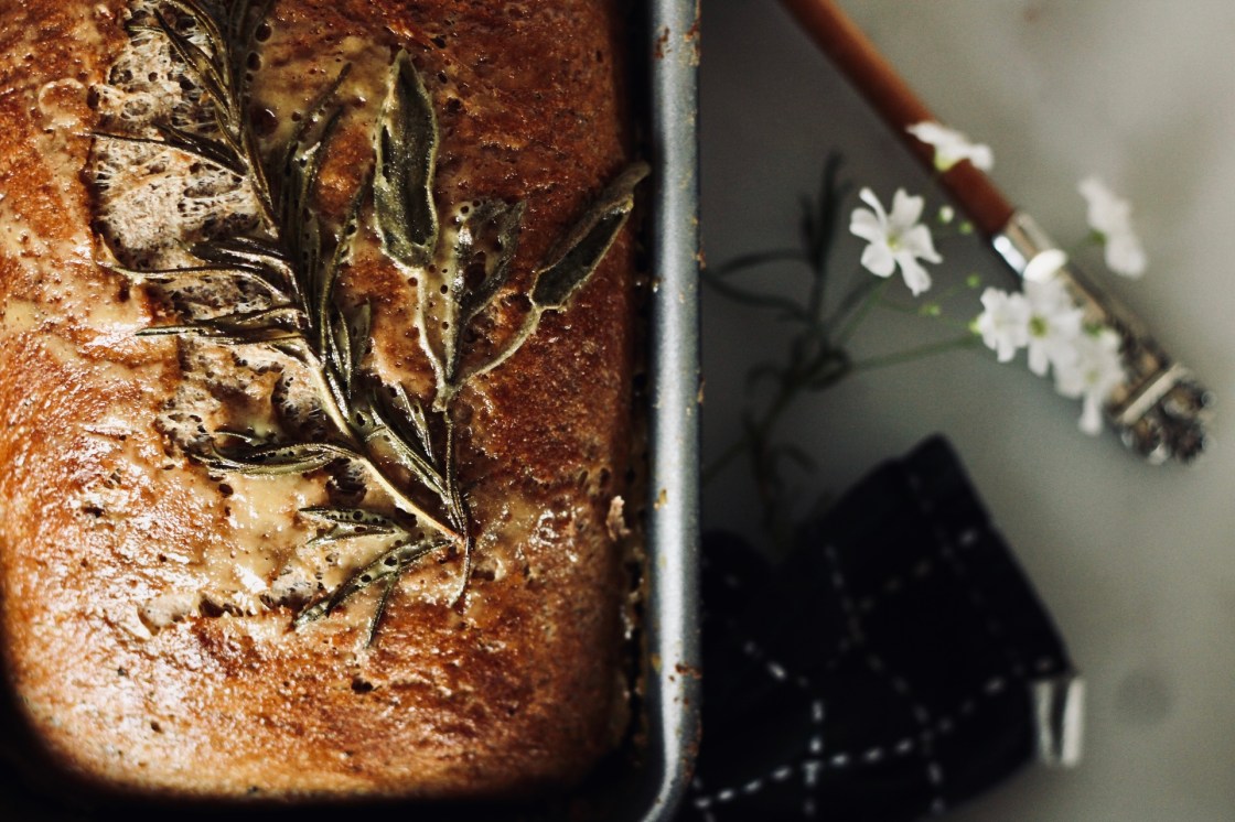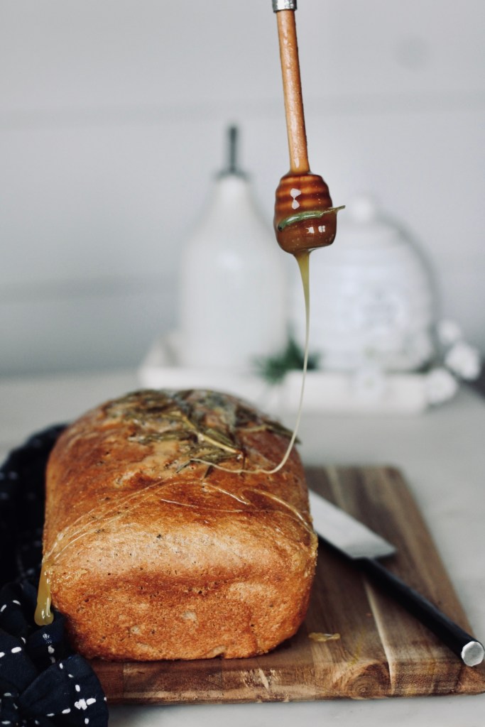 - Preheat oven to 350degrees. Drizzle a few tablespoons of honey over the bread, and place sprigs on top. Bake for 35-45 minutes, or until you press the top and it doesn’t sink. Pull out of oven and enjoy!! Slab some grass fed butter and drizzle that extra honey over the top…. mmm….