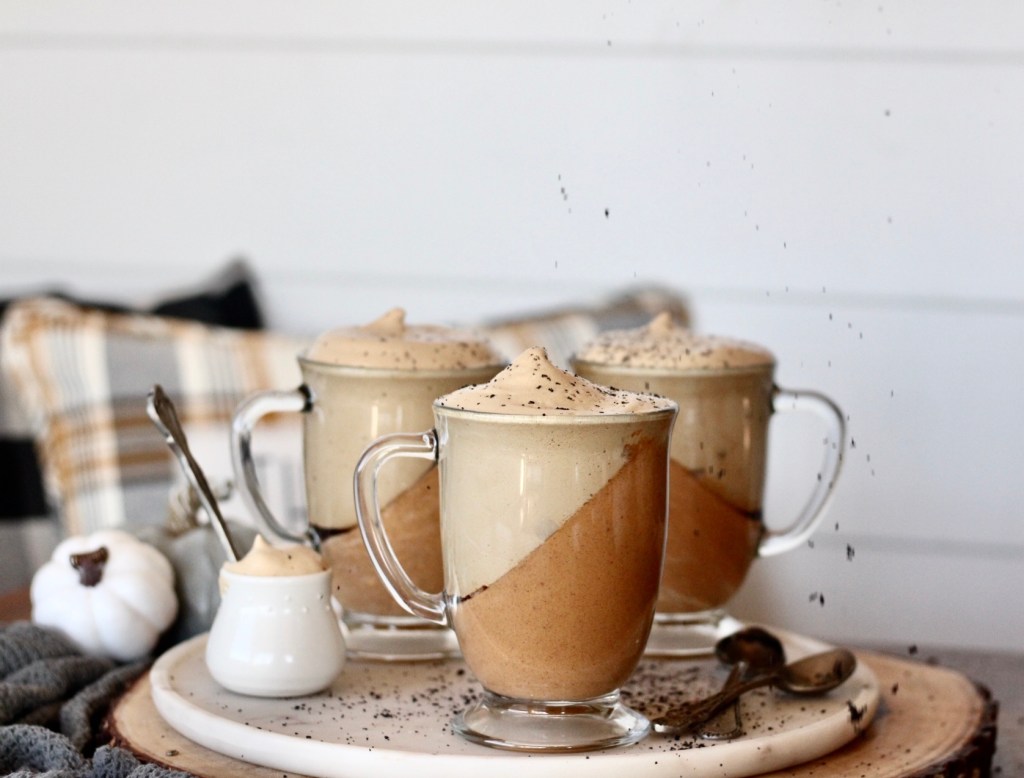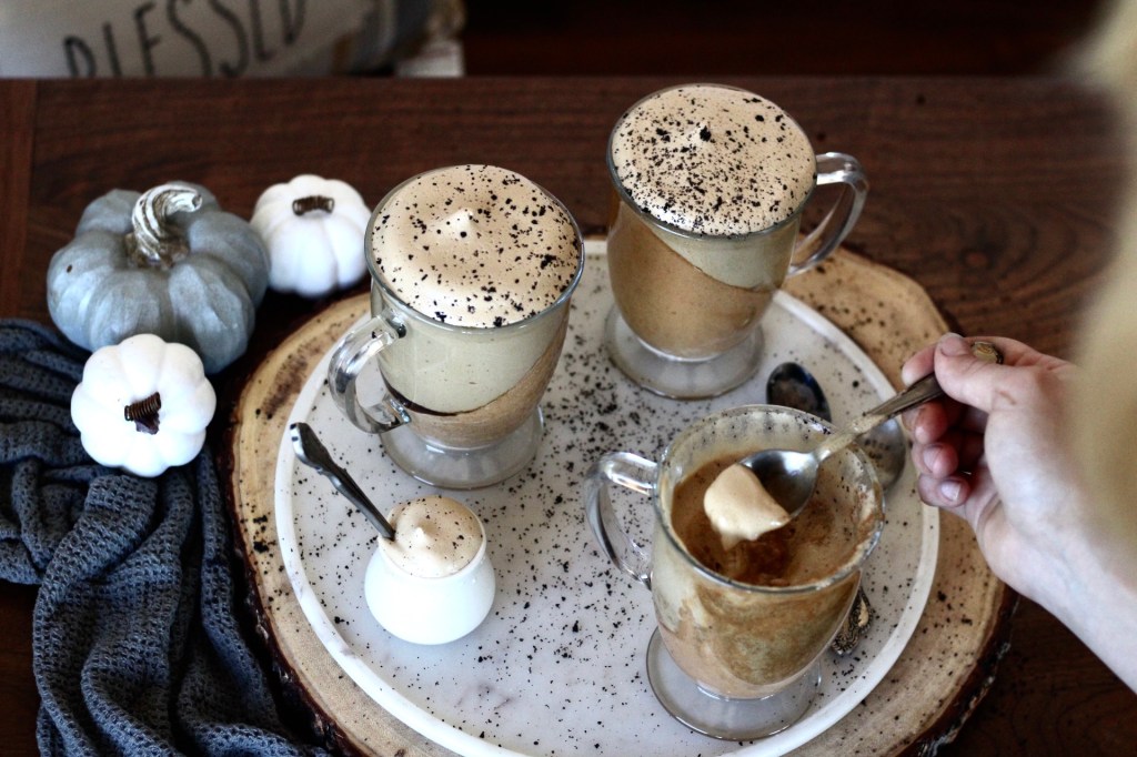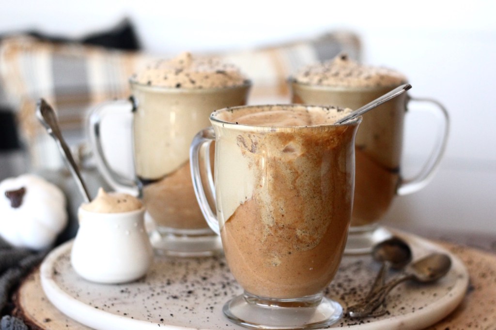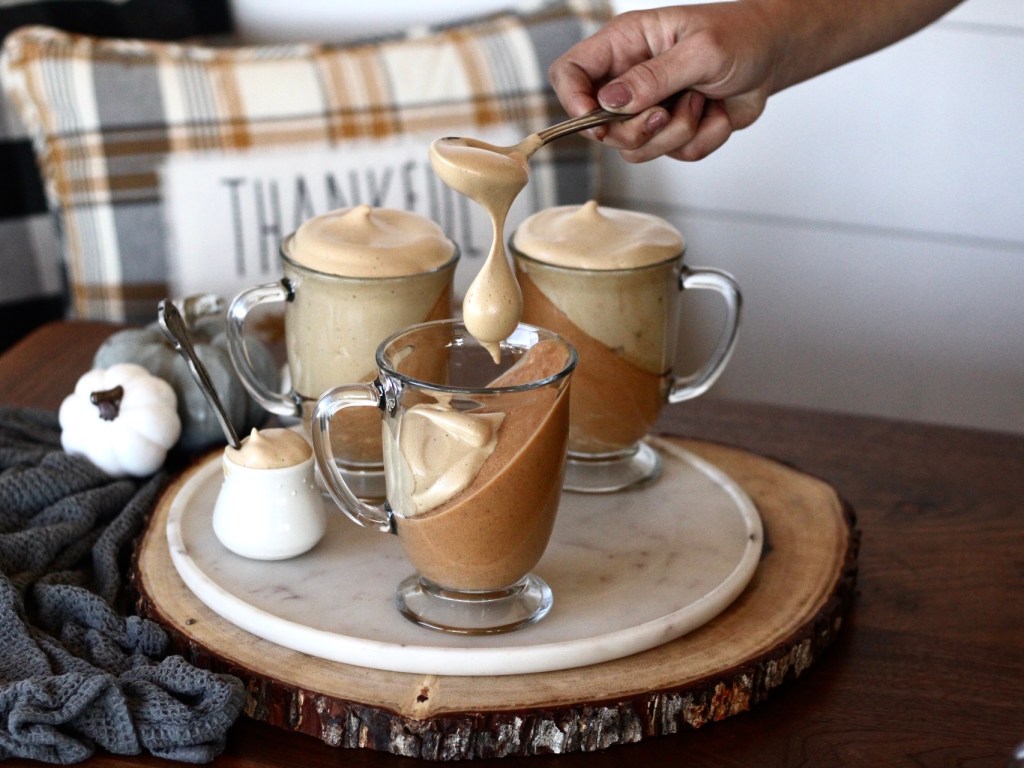 - In a electric mixer whip whipping cream until stiff peaks, gently mix in the pumpkin mix with the whipping cream, now pour into prepared mugs and let sit for 4-6 hours or overnight (witch is ideal)