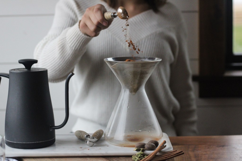 - Boil water, meanwhile grind the coffee beans. Place coffee beans and spices into the strainer on your pour over.