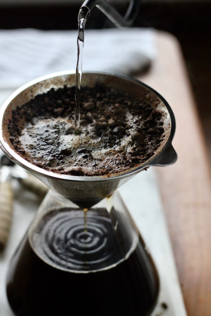 Now it’s time to pour over, pour the hot water over the coffee and spices and watch the magic happen!! Perfect rainy day for this coffee, ain’t it?