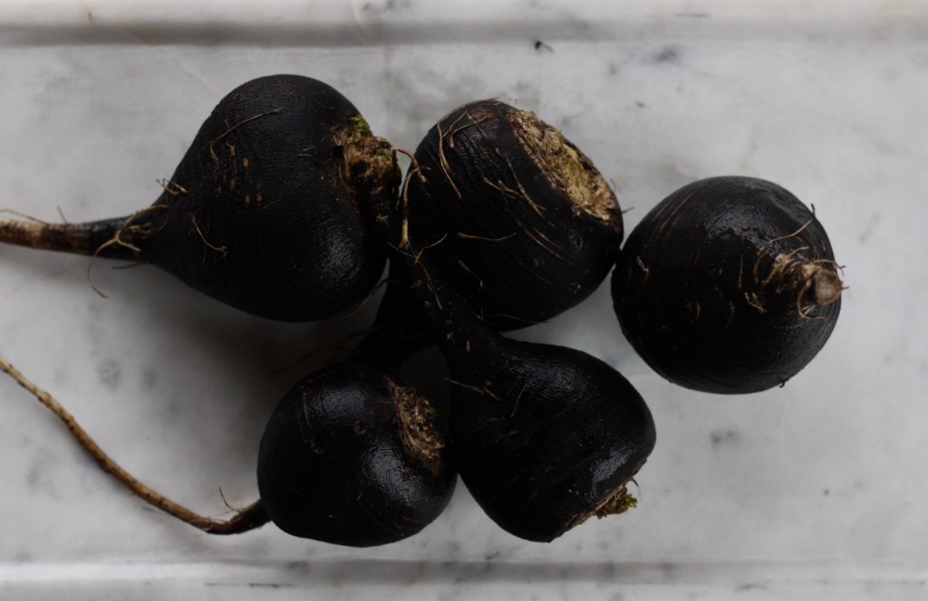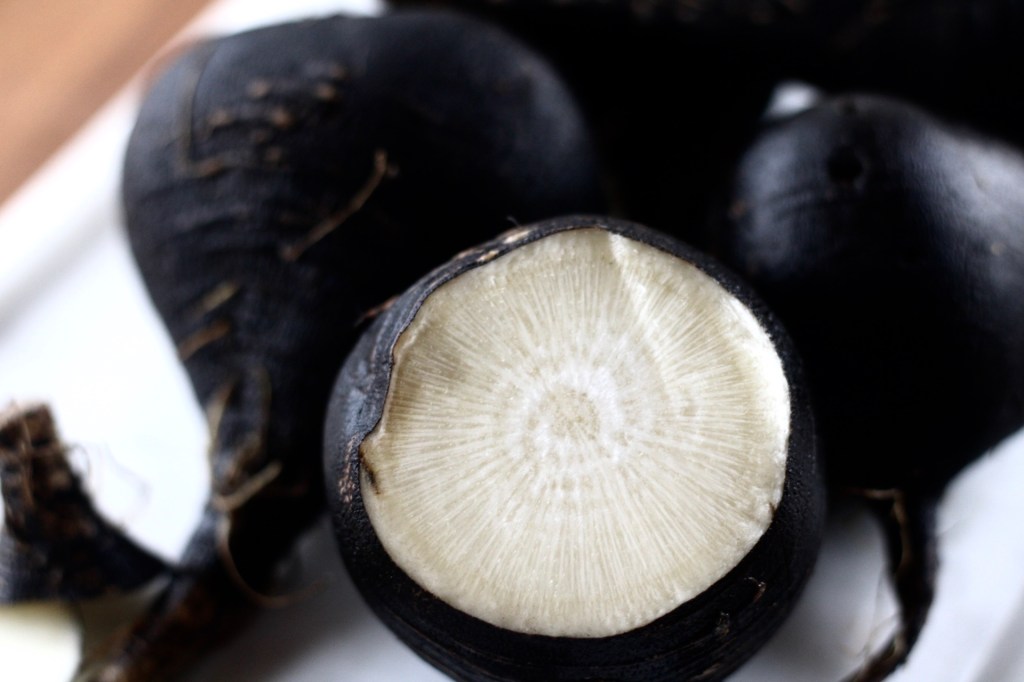 Black radishes are root vegetables of the family Brassicaceae, and are a winter variety radish. Black radishes are white and black on the outside.