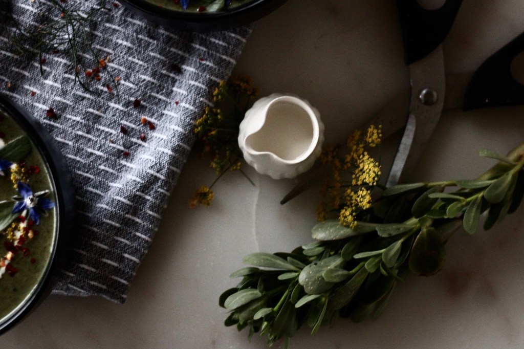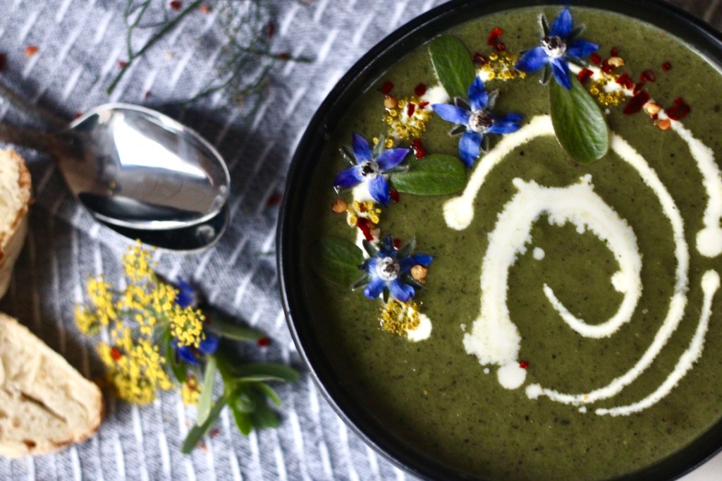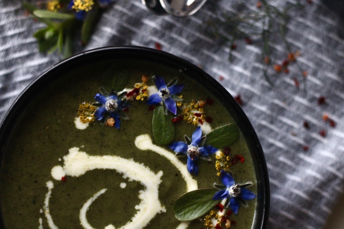 - Blend with a stick blender, paddle into bowls, drizzle soup coconut milk then top with fennel and borage flowers. Enjoy!!