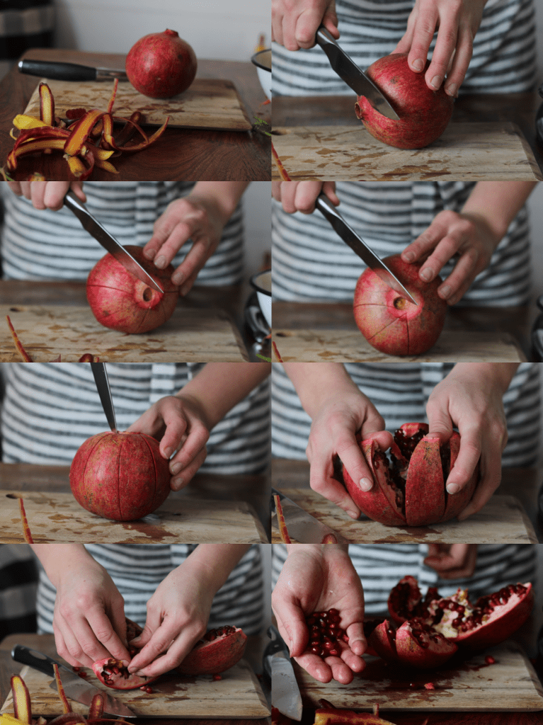 First your going to cut that top part off. Then, using your favorite knife score the sides by starting at the top and slowly working your way down, you can see how I kind of moved the pomegranate away from the board and pulled the knife toward me. Pull apart by putting your fingers in the middle and pulling the pieces away from each other. And voala! Easy! Now you got pomegranates to eat!