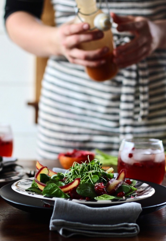 Oh yeah, this is one of my favorite dressings… based with olive oil I put some fresh squeezed blood orange, coconut vinegar, honey, and some coriander.