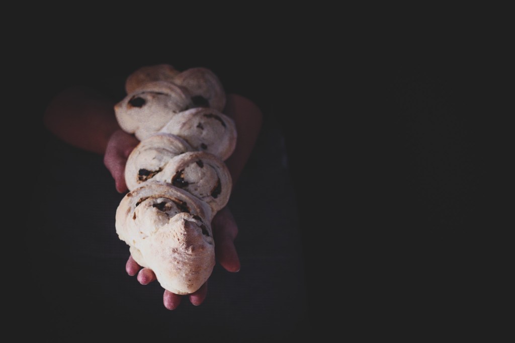 - Spread the black garlic around the dough until covered. Sprinkle rosemary and salt then roll into a tight log, cut in half. Using clean scissors, start at the bottom of your dough and work your way up. At a 45 degree angle, cut a piece of the dough about 3/4 the way through and lay it to one side. Continue cutting pieces of the dough laying each piece to the opposite side of the one before it. Make sure you do not cut all the way through.