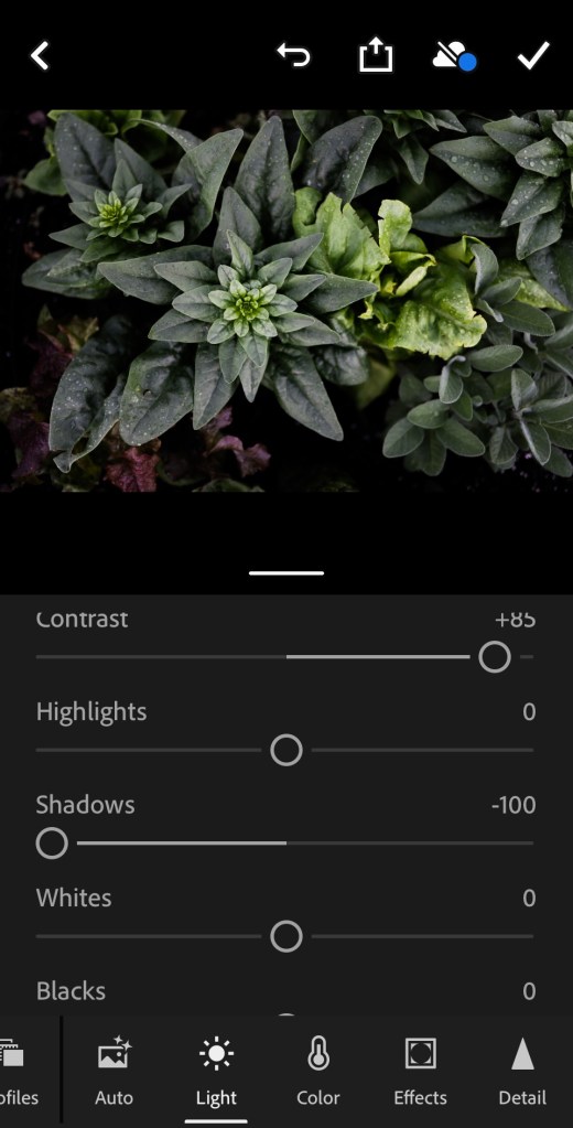 More shadows? Less shadows?? Does this need to even be messed with? In this picture, I did make the shadows more darker because I like the intensity of the spinach and I really like the dark areas in this picture.