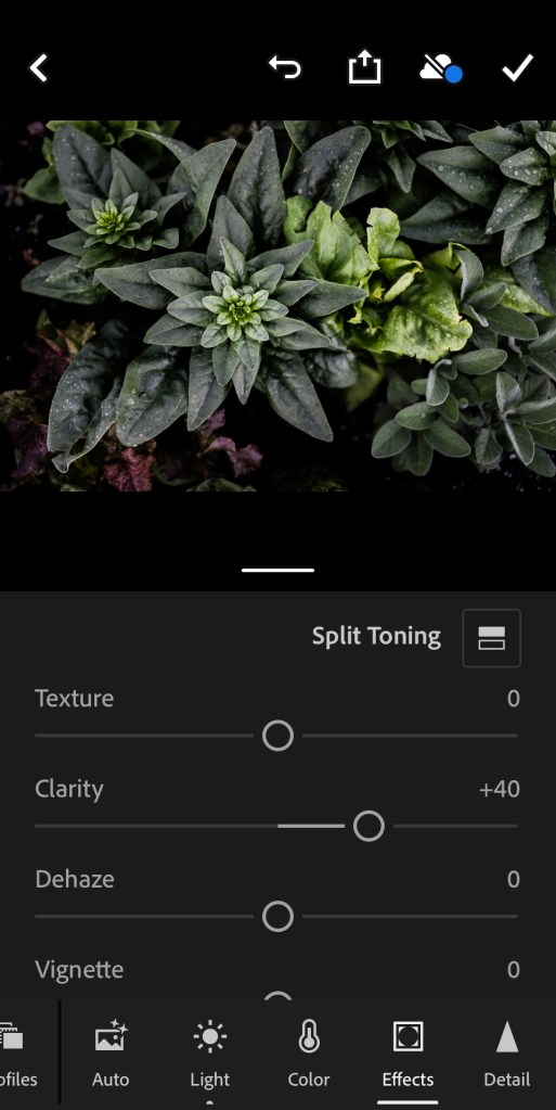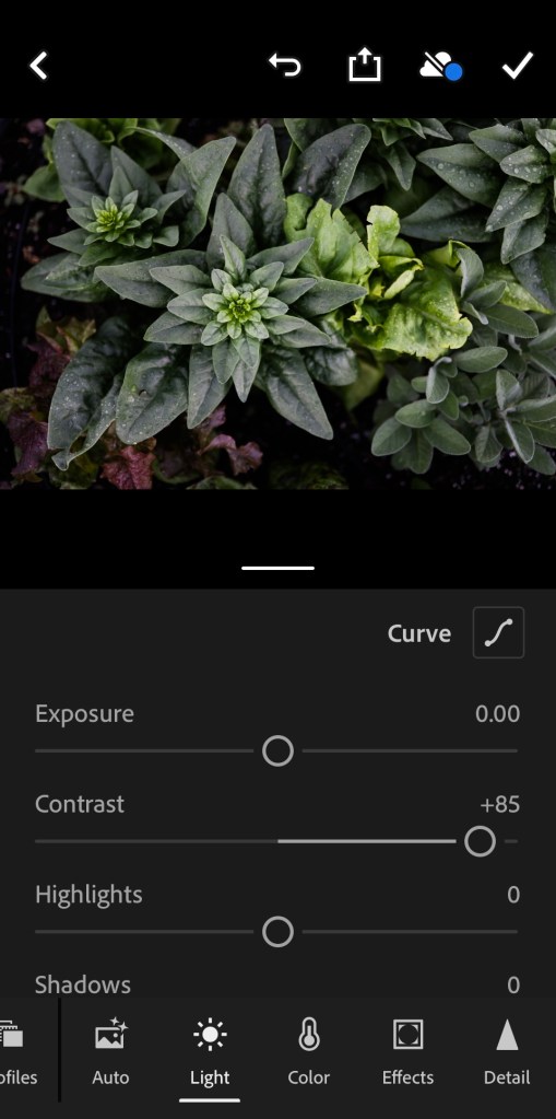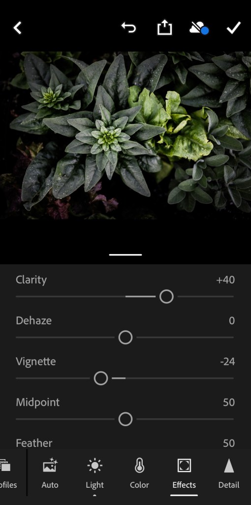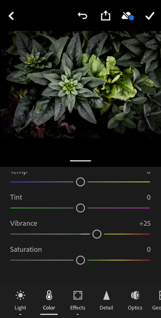 I did a +25% vibrance here. I feel like you can easily go overboard on vibrance so try to stay in the lower range.