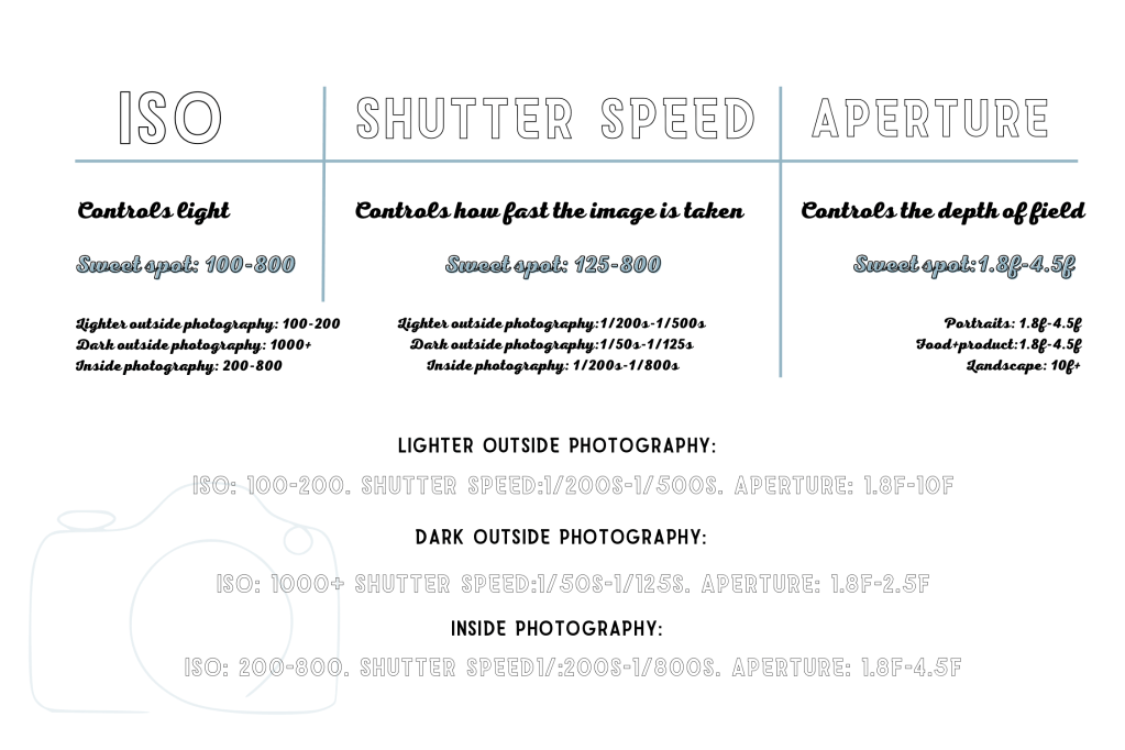 ISO: ISO plays a big role in light sensitivity; the higher the ISO, the brighter but more grainy picture you will get; the lower the ISO, the crisper but darker picture you will get. Sweet spot: 100–800 shutter speed.