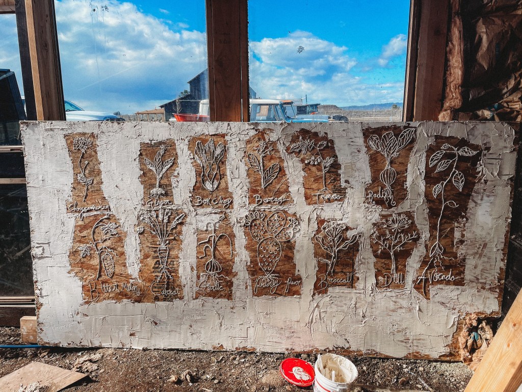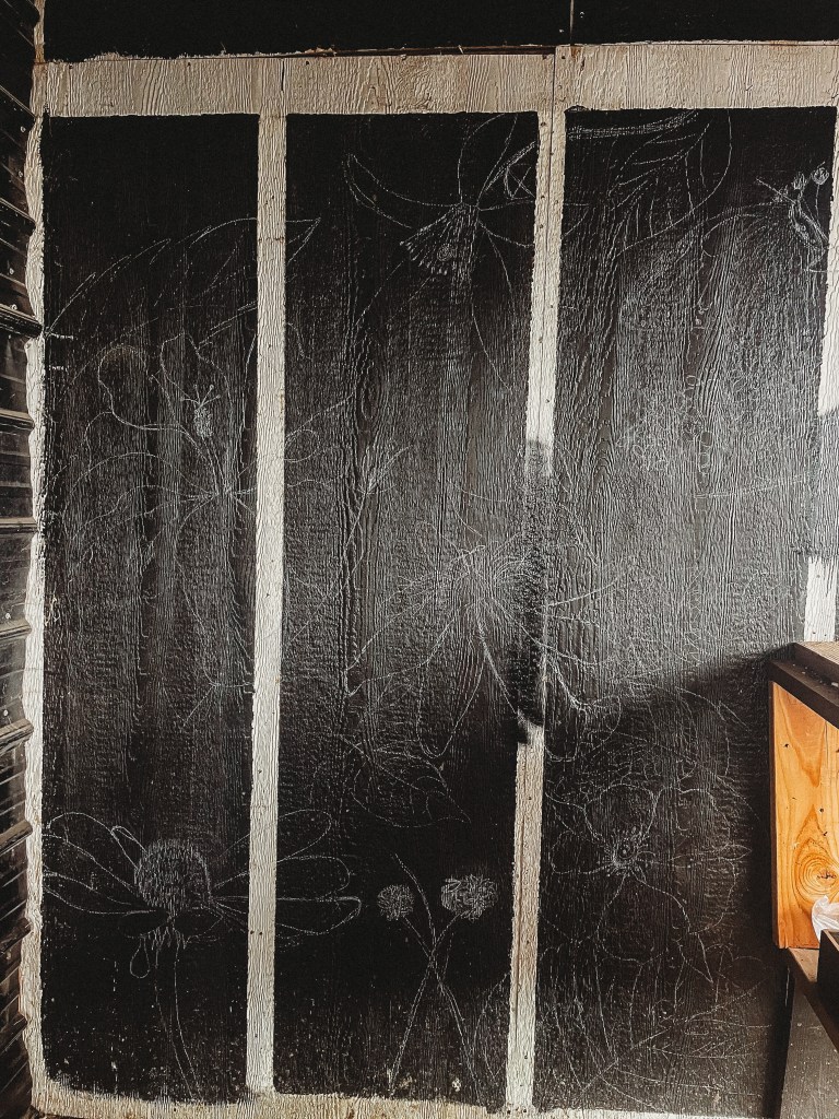 So one day I thought, “what can I do with this borin’ old wall?!” Then wondering how I can cover the texture of the walls, I thought “dry wall compound!!” we had just done some drywall compound in between live edge logs on the wall of our cottage, so I knew what I was up against 😂. I mean, it’s like icing cake that does melt!! How fun?! Wohoo!! (All tho cannot be enjoyed my consumption sadly)